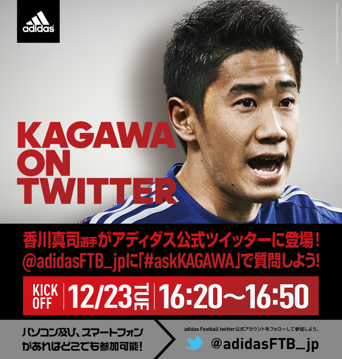 開催日時は23日(火)午後4時20分から午後4時50分までの30分間で、開始とともに「アディダス公式ツイッター(@adidasFTB_jp)」に香川が登場。この時間内にツイッター上でハッシュタグ「#askKAGAWA」を付けて質問を投稿することで参加できる。