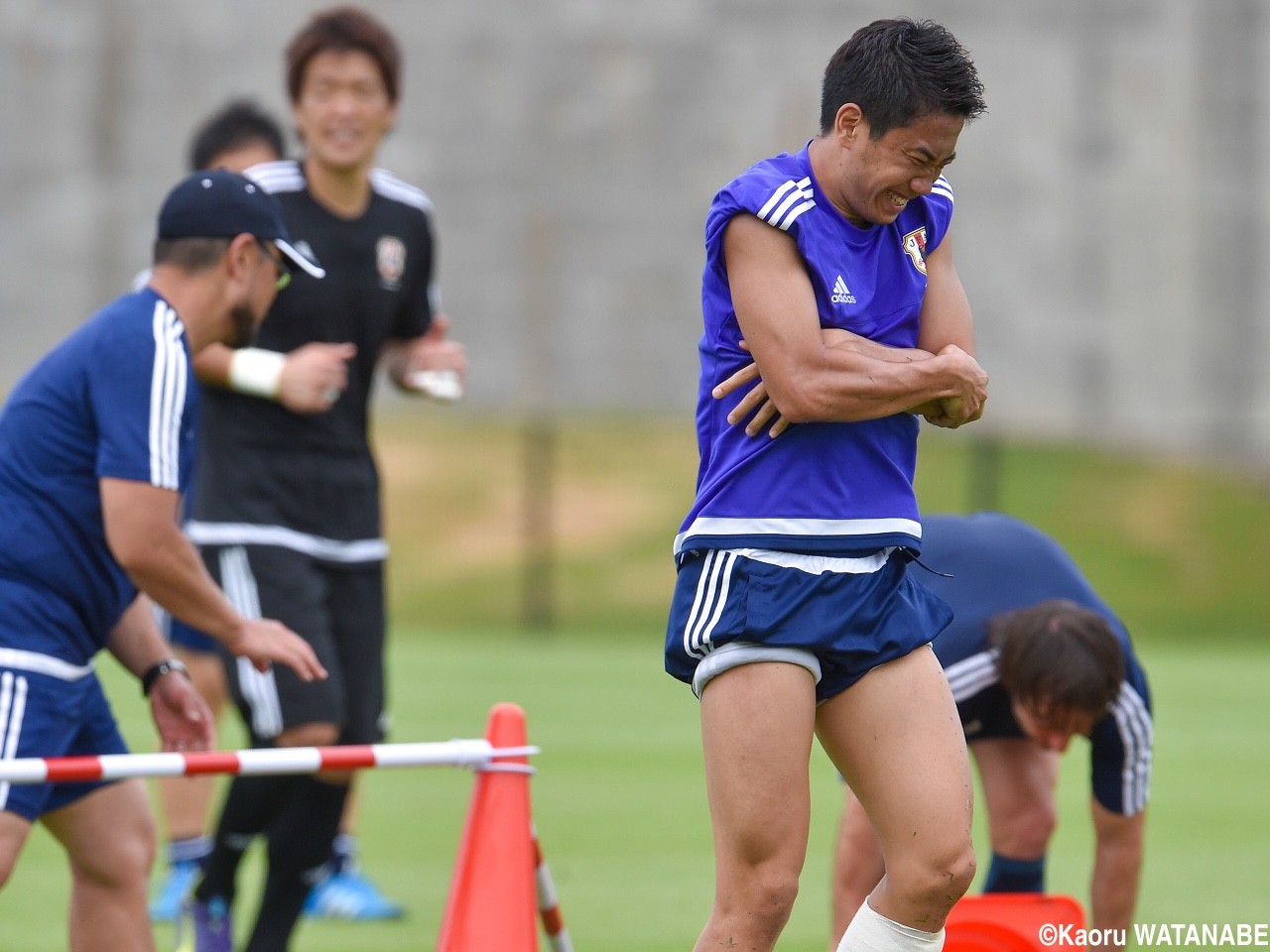 全体練習が終わると、MF香川真司(ドルトムント)は一目散にロッカールームへ引き揚げた。香川以外の選手たちは全員、ピッチに残って自主練習を行っており、アクシデントかと心配されたが、練習後、報道陣の取材に応じた香川は「(フットバレーをしているときに)着地でひじを打っただけ」と説明。控室で念のため左ひじの治療を受けたが、大きな問題はなかったようで、「こんなのでケガをしたら試合にならない。集中してやらないと」と表情を引き締めた。
