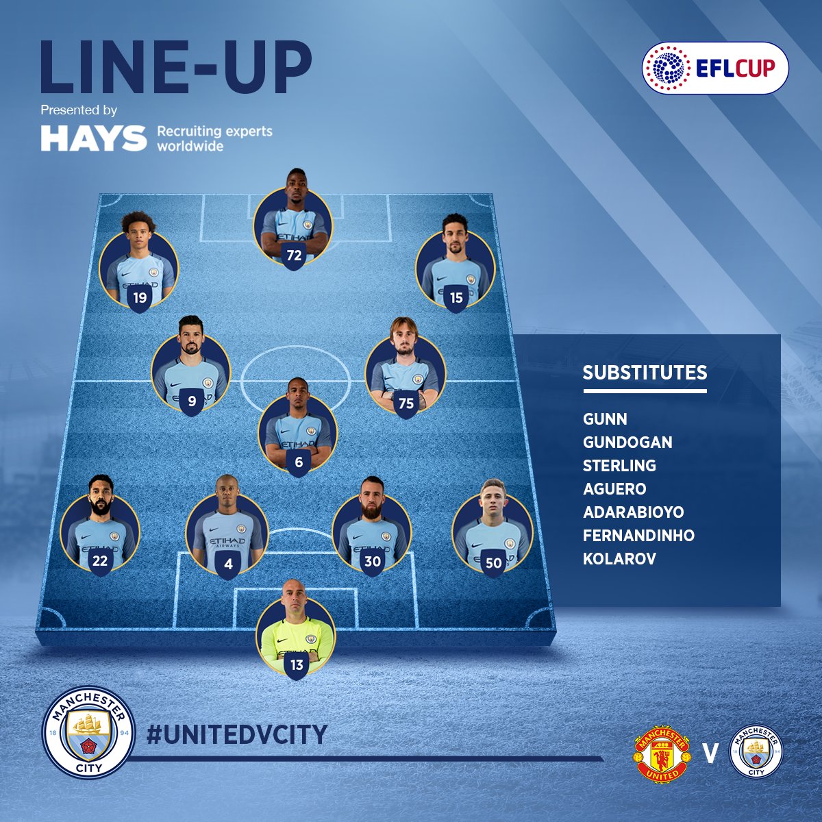 23日のプレミアリーグ第9節でチェルシーに0-4で敗れたユナイテッドは、4人を変更。MFフアン・マタやMFマイケル・キャリック、DFルーク・ショー、DFマルコス・ロホが先発に名を連ねた。一方、公式戦5試合勝利がない(3分2敗)シティは、伝統の一戦でターンオーバーを採用。23日の第9節サウサンプトン戦から9人を入れ替え、FWノリートらのほか、DFパブロ・マッフェオ(18)、MFアレイシュ・ガルシア(19)といった若手も先発に送り込んだ。