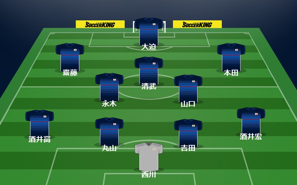 日本代表、スタメン発表! GK:西川 DF:丸山、酒井宏、酒井高、吉田 MF:永木、清武、山口 FW:本田(Cap)、齋藤、大迫 https://t.co/6qn5qJVsBZ #daihyo
