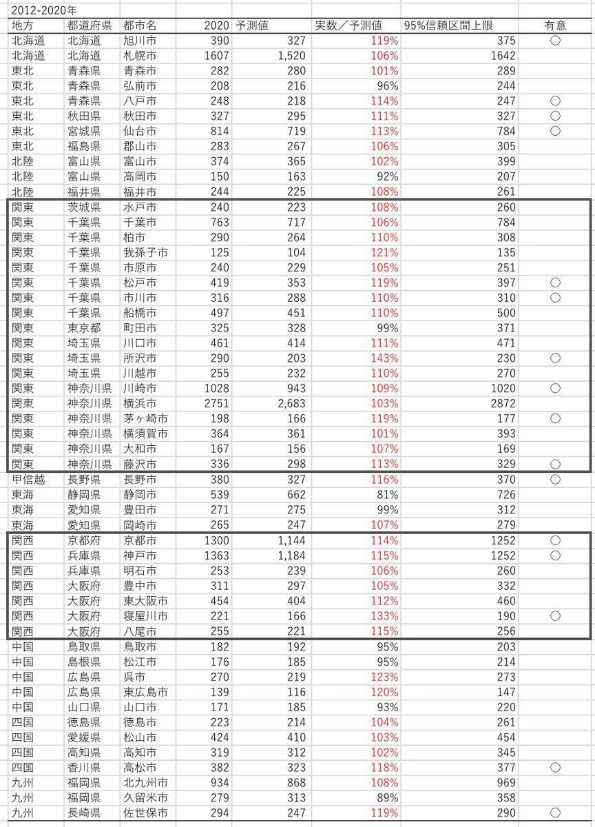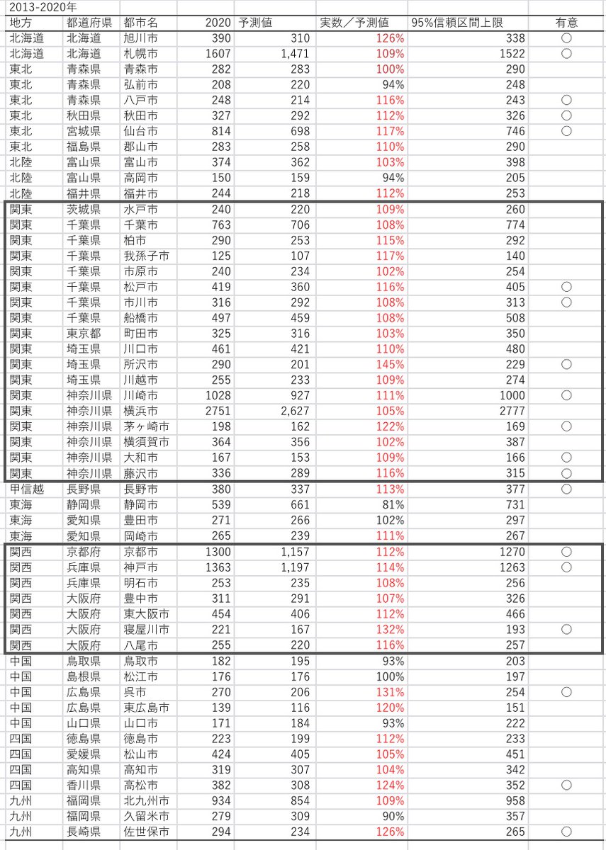 2012年は外国人を含まないデータのため、それを除いた分析も行ってます(2013ー2020年分析)。95%信頼区間上限は標準偏差から求めた簡易的なものです。