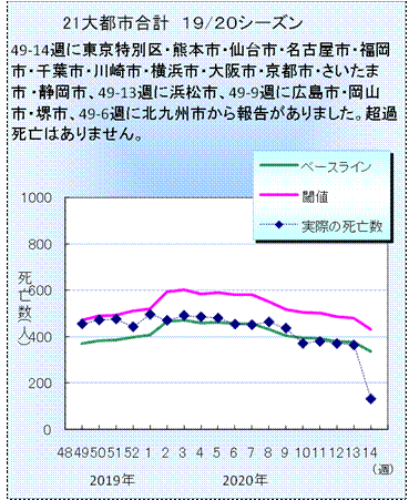 ⇒インフルエンザ関連死亡迅速把握システムによる2019/20シーズン21大都市インフルエンザ・肺炎死亡報告(NIID)