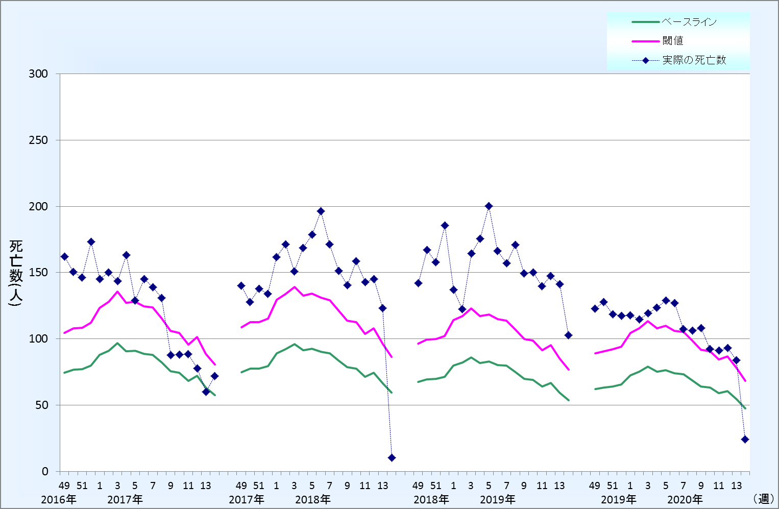A. このシステムでは、東京では過去3シーズンにわたって超過死亡を認めています。2019-2020年シーズンも東京で超過死亡が観察されていますが、「実際の死亡数」は過去3シーズン並みか、やや低い傾向にあります(図)。