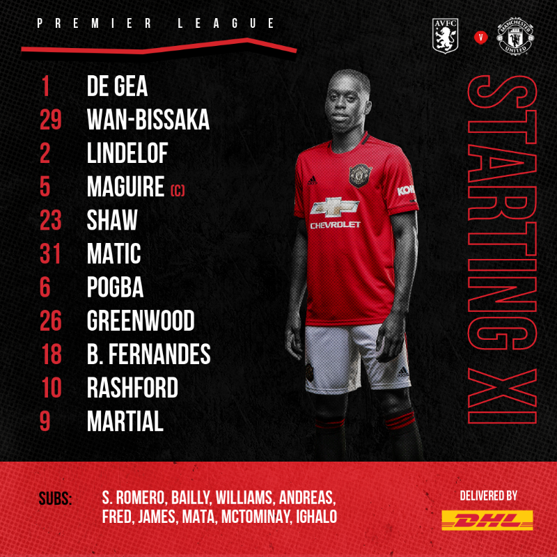 De Gea; Wan-Bissaka, Lindelof, Maguire(C), Shaw; Matic, Pogba, Greenwood, Bruno Fernandes, Rashford; Martial.