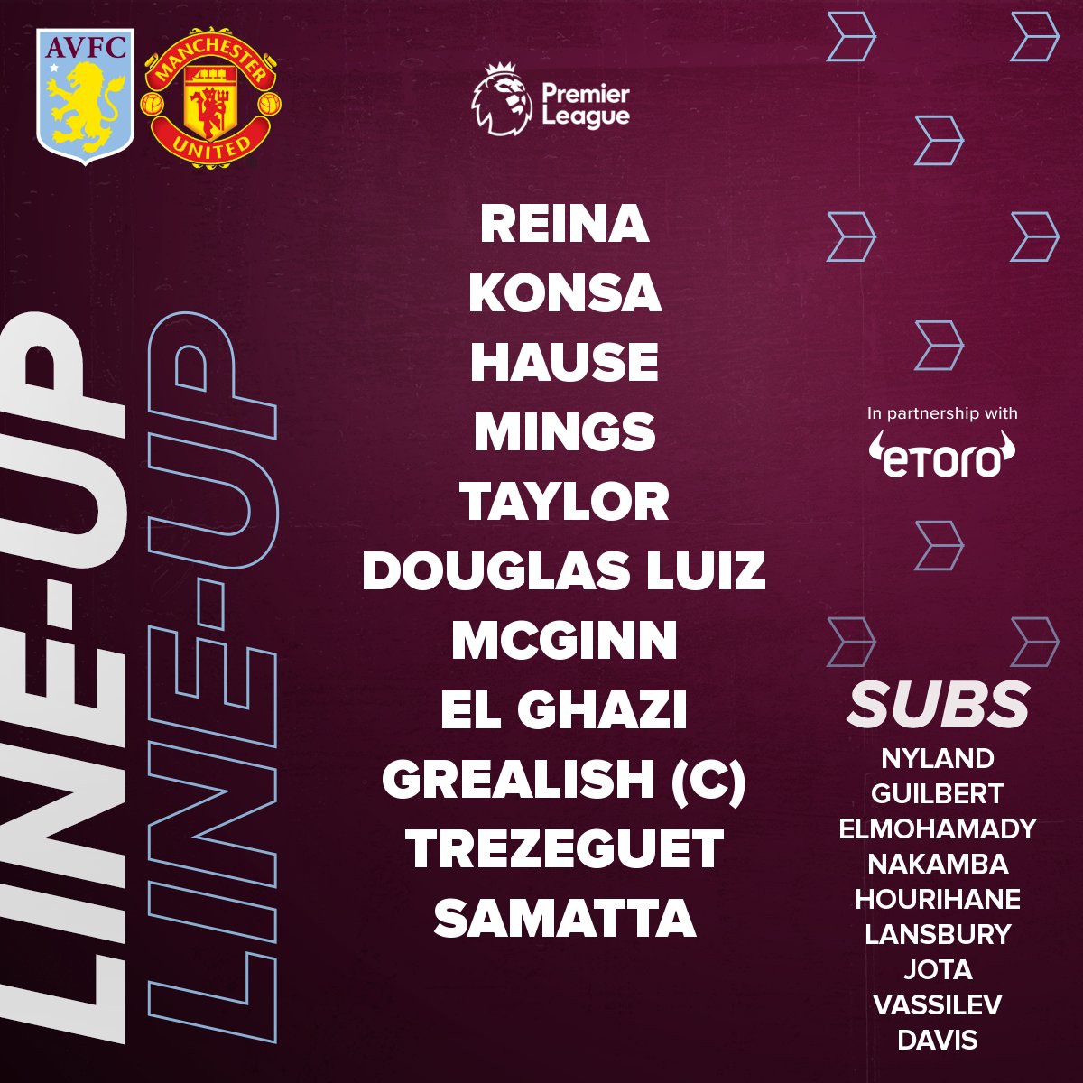 Reina; Konsa, Hause, Mings, Taylor; Douglas Luiz, McGinn, El Ghazi; Grealish(C), Trezeguet, Samatta.