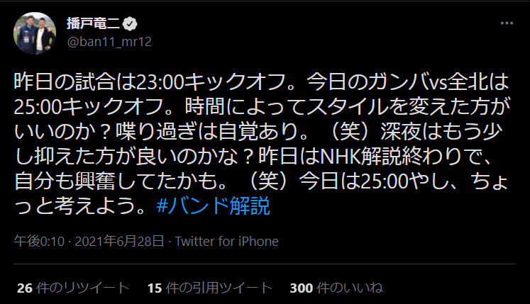 — 播戸竜二 (@ban11_mr12) June 28, 2021