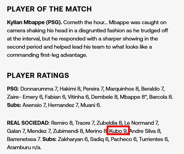⇒Paris Saint-Germain 2-0 Real Sociedad: Kylian Mbappe sparkles as Luis Enrique's men take Champions League first-leg lead(EuroSport)