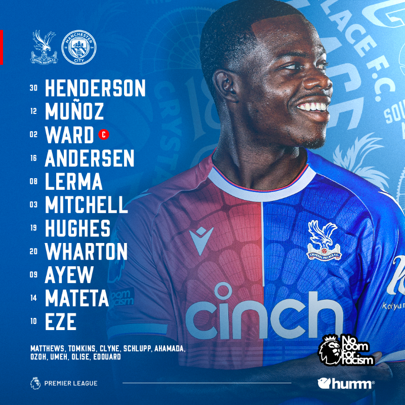 Henderson; Munoz, Ward(C), Andersen, Lerma, Mitchell; Hughes, Wahrton, Ayew, Eze; Mateta.