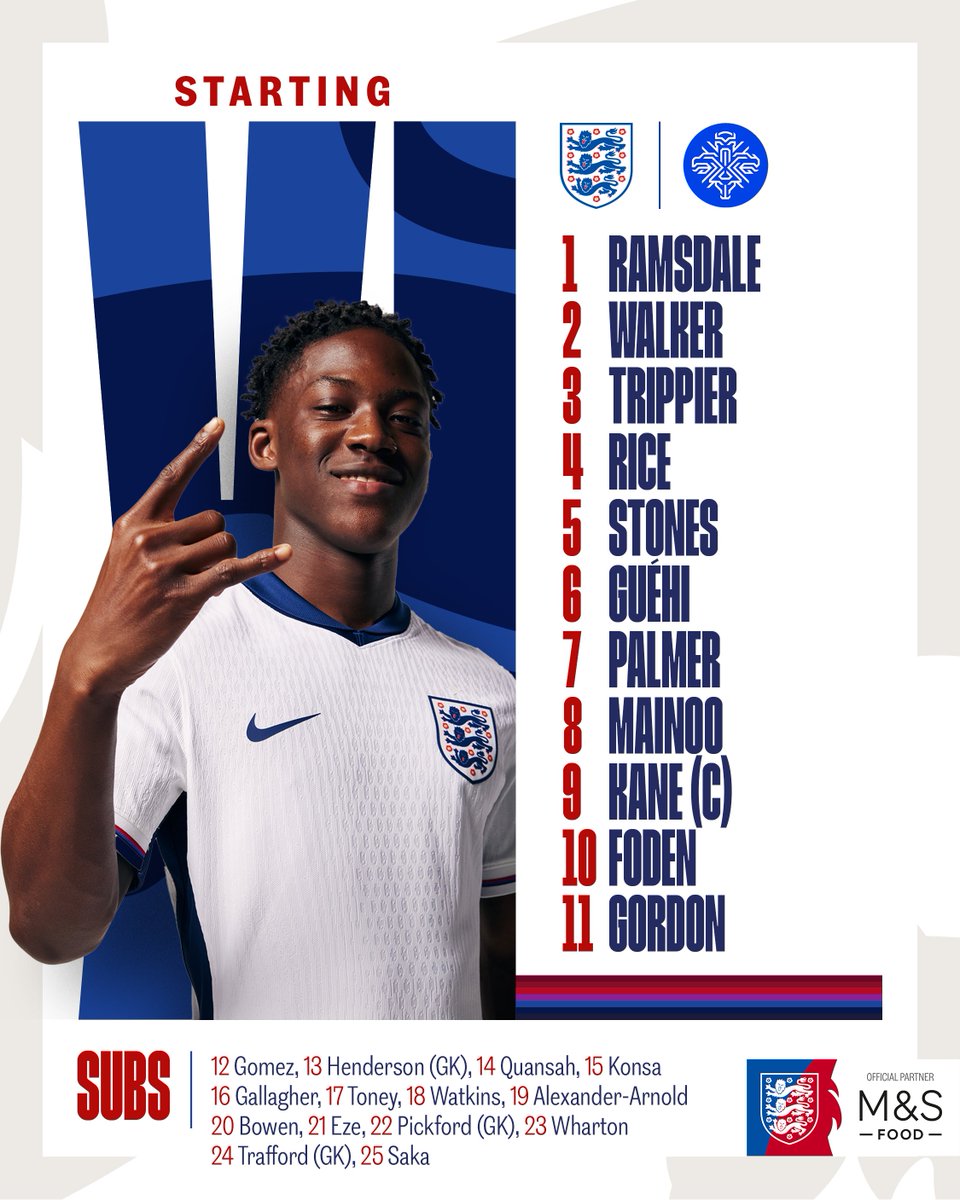 Ramsdale; Walker, Stones, Guehi, Trippier; Mainoo, Rice, Palmer, Foden, Gordon; Kane(C).