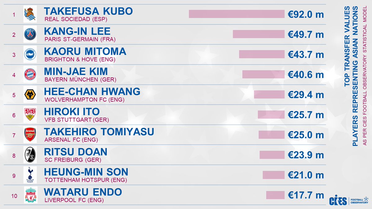 権威あるCIESフットボールオブザーバトリーによると、レアルからの日本人選手の移籍金は9,200万ユーロで、2番目のカン・イン・リー(49.7ユーロ)のほぼ2倍となる。