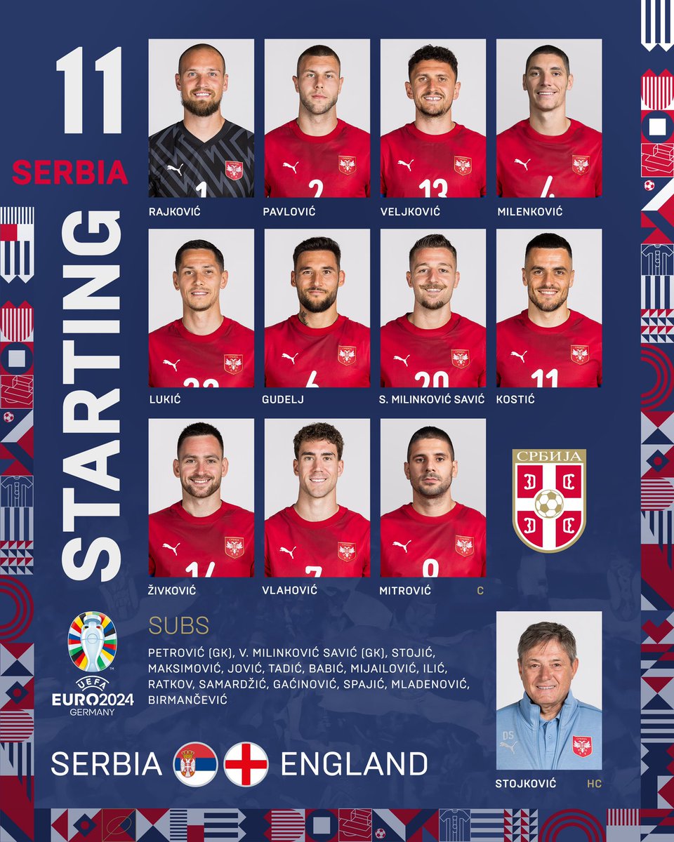 Rajkovic; Veljkovic, Milenkovic, Pavlovic; Zivkovic, Sergej, Gudelj, Lukic, Kostic; Vlahovic, Mitrovic(C).