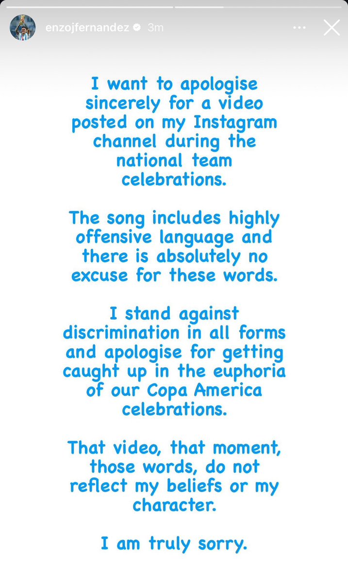 代表チームの祝賀会中に私のインスタグラムチャンネルに投稿した動画について、心からお詫び申し上げます。この歌には非常に不快な言葉が含まれており、これらの言葉に言い訳の余地はまったくありません。私はあらゆる形態の差別に反対し、コパ・アメリカの祝賀会の熱狂に巻き込まれたことをお詫び申し上げます。あの動画、あの瞬間、あの言葉は、私の信念や性格を反映するものではありません。本当に申し訳ありません。