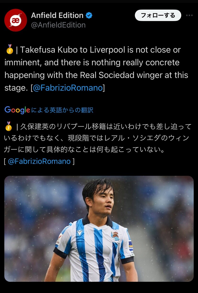 🥇| 久保建英のリバプール移籍は近づいているわけでも差し迫っているわけでもなく、現段階ではレアル・ソシエダのウィンガーに関して特に具体的なことは何も起こっていない。[@FabrizioRomano]