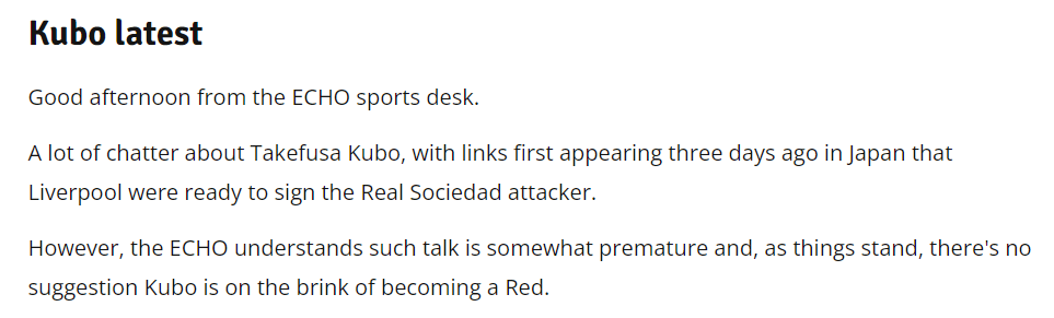 しかし、エコーはそのような話は時期尚早であると理解しており、現状では久保がリバプールに合流するとは思えません。