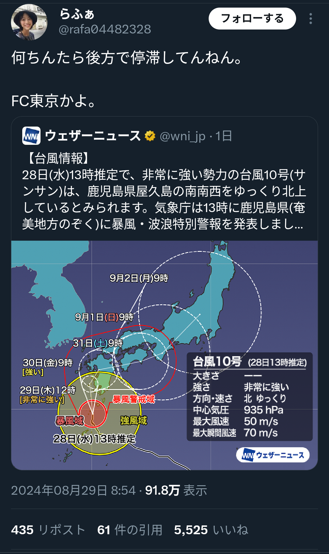 現在接近中の台風10号の影響が予想される8月31日(土)明治安田J1リーグ第29節FC東京戦(@エディオンピースウイング広島、18:30キックオフ)につきまして、現時点では通常通りの開催を予定しています。(8月30日(金)9:00時点)