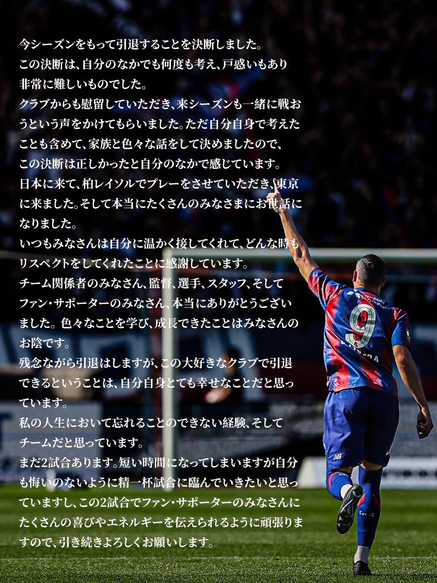 残念ながら引退はしますが、この大好きなクラブで引退できるということは、自分自身とても幸せなことだと思っています。