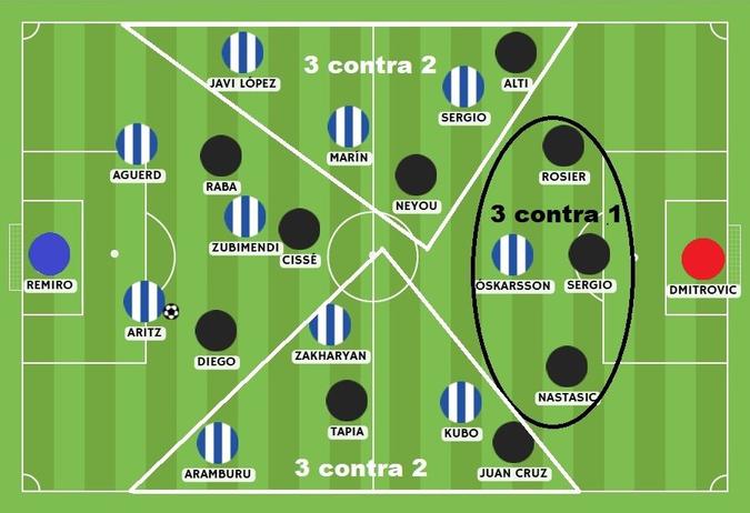 3分です。アランブルは自由にボールを受け、理論上はタピアがサイドに出て彼の前進を阻止するはずだが、もしそうするとベネズエラ人はザハリャンとともに内側でプレーできるようになる。久保はセンターバックのナスタシッチに近い内側のゾーンに留まっているため、ウイングバックのフアン・クルスがチュリ・ウルディンのフルバックに代わって飛び込む可能性もあるが、日本人はすぐにポジショニングを修正し、さらに偏った動きを続けるだろう。