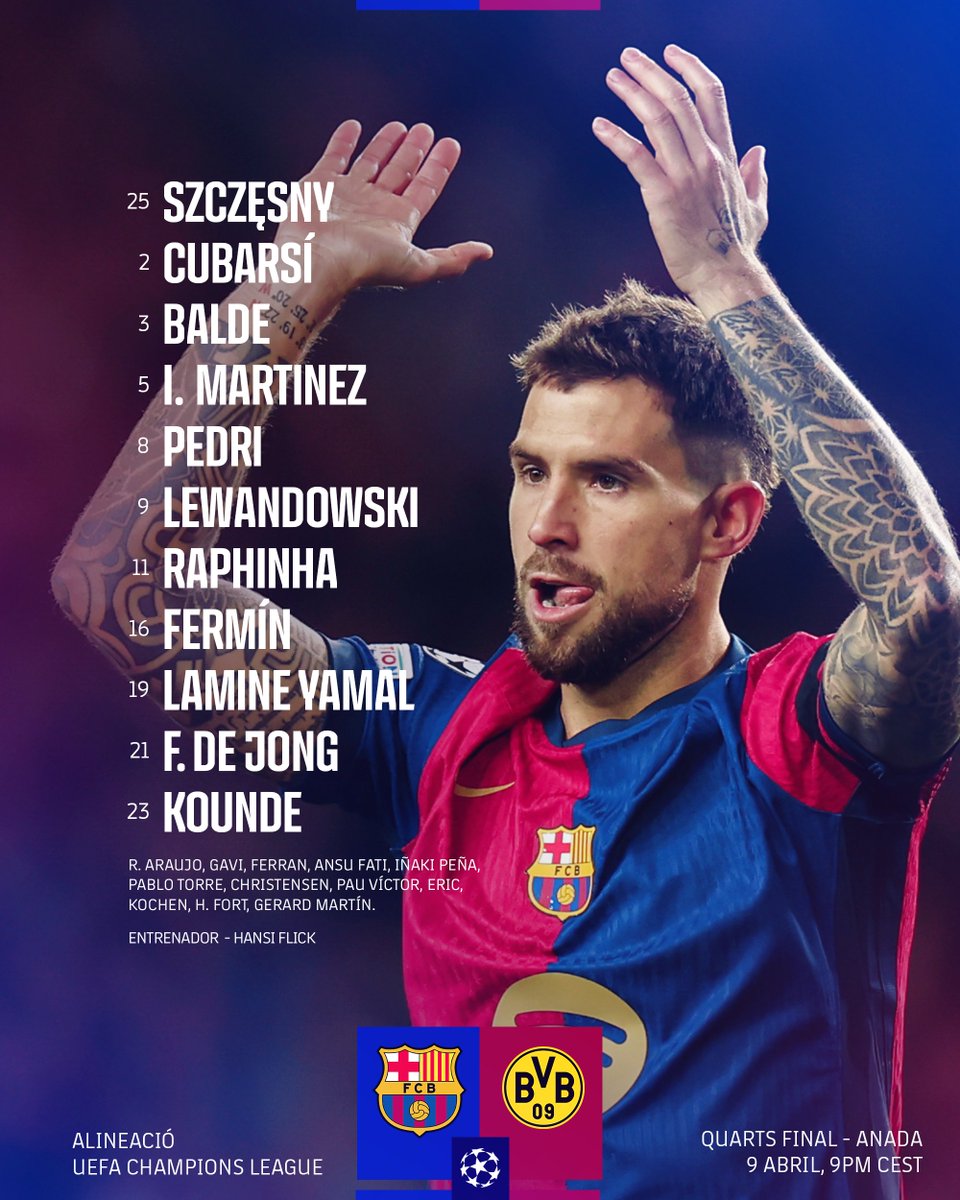 Szczesny; Kounde, Cubarsi, Inigo Martinez, Balde; de Jong(C), Pedri, Fermin; Lamine Yamal, Lewandowski, Raphinha.