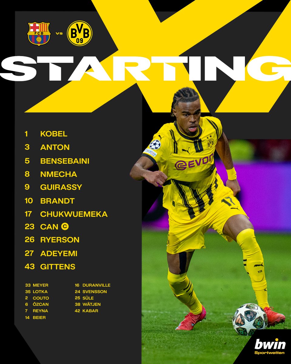 Kobel; Bensebaini, Anton, Emre Can(C), Ryerson; Nmecha, Chukwuemeka, Brandt; Adeyemi, Guirassy, Gittens.