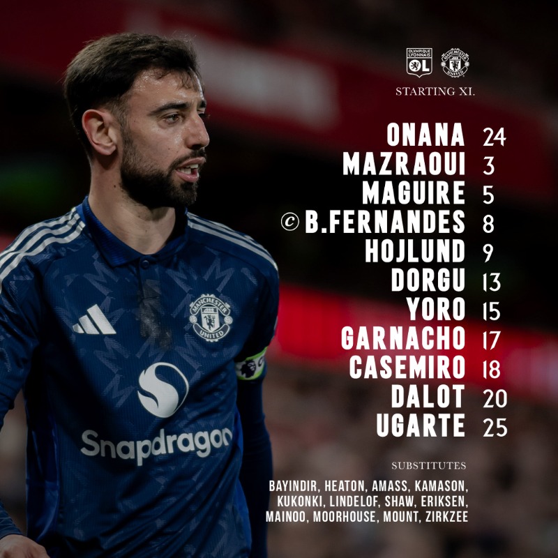 SUBS: Bayindir, Heaton, Amass, Kamason, Kukonki, Lindelof, Shaw, Eriksen, Mainoo, Moorhouse, Mount, Zirkzee.