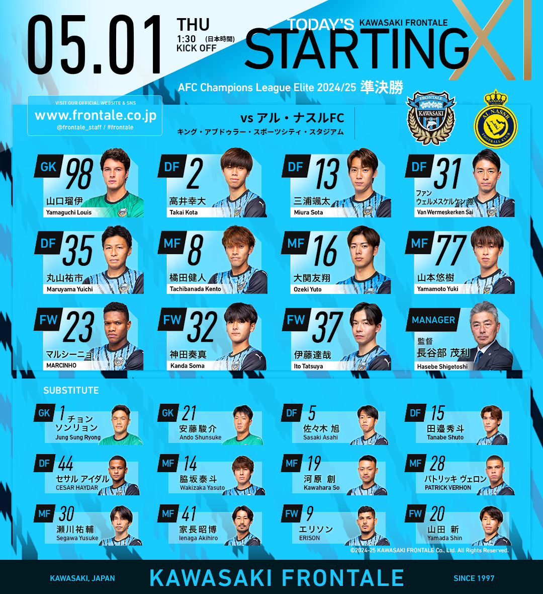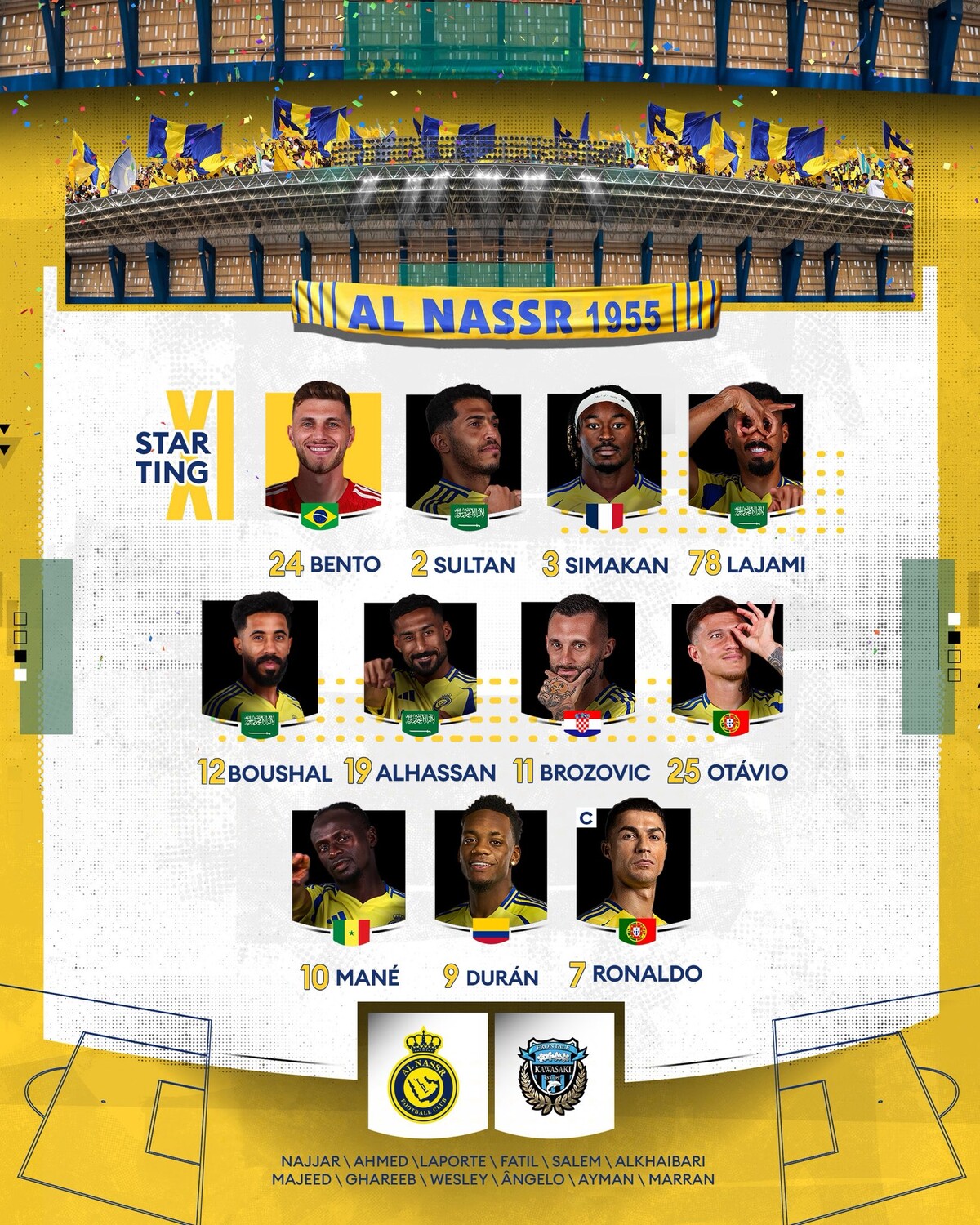◆ACLE◆R4 アル・ナスル×川崎F スタメン発表!ロナウド、マネ先発、川崎はマルシーニョ・神田・伊東の3TOP