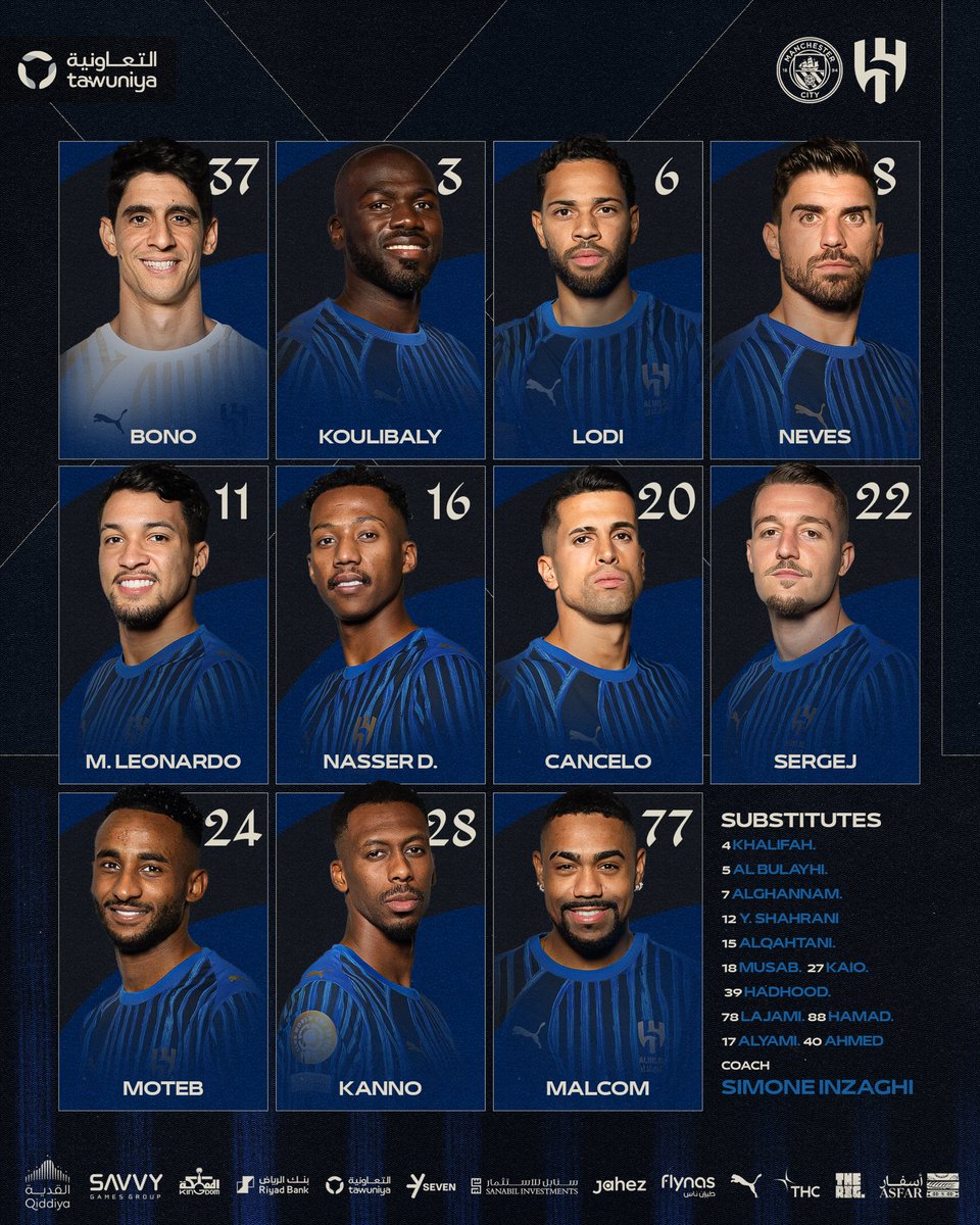 Bono; Cancelo, Koulibaly, Al-Harbi, Renan Lodi; Kanno(C), N.Al-Dawsari, Ruben Neves, Milinkovic-Savic; Malcom, Marcos Leonardo.