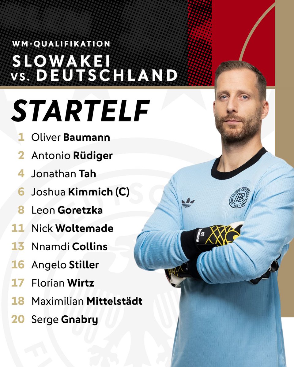 Baumann; Collins, Rudiger, Tah, Mittelstadt; Kimmich(C), Stiller, Gnabry, Goretzka, Wirtz; Woltemade.