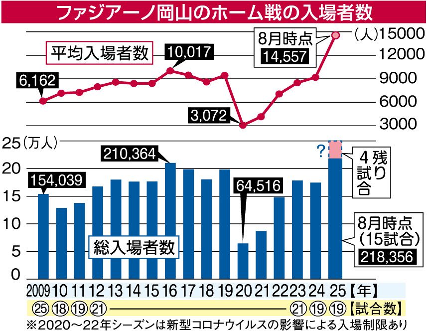 サッカーJ1ファジアーノ岡山のホーム戦の今季入場者数が累計で21万8356人(15試合)に達し、4試合を残してシーズン最多を更新した。8月23日の湘南戦で、これまでの最多だった2016年(21万364人)を上回った。念願のJ1初参戦により開幕からチケット完売が相次いでおり、〝昇格効果〟を反映した形だ。
