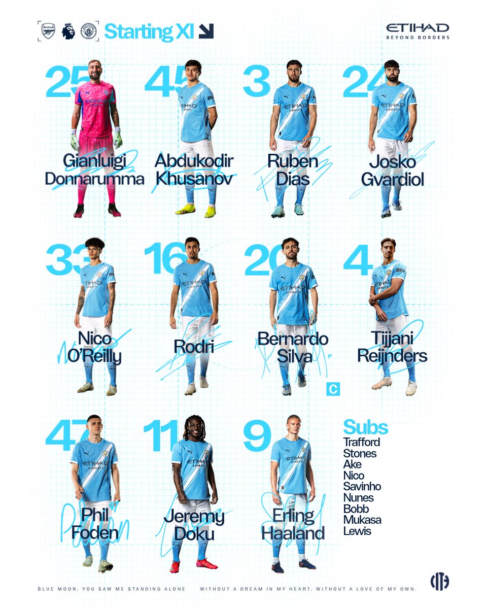 Donnarumma; Khusanov, Ruben Dias, Gvardiol, O'Reilly; Rodri, Bernardo(C), Reijnders, Foden, Doku; Haaland.