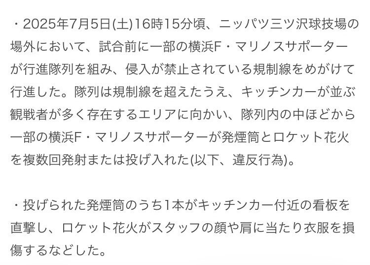 >横浜F・マリノスでは、今回の事案を極めて重く受け止めております。クラブとして、再発防止に向けたサポーター管理体制の強化、