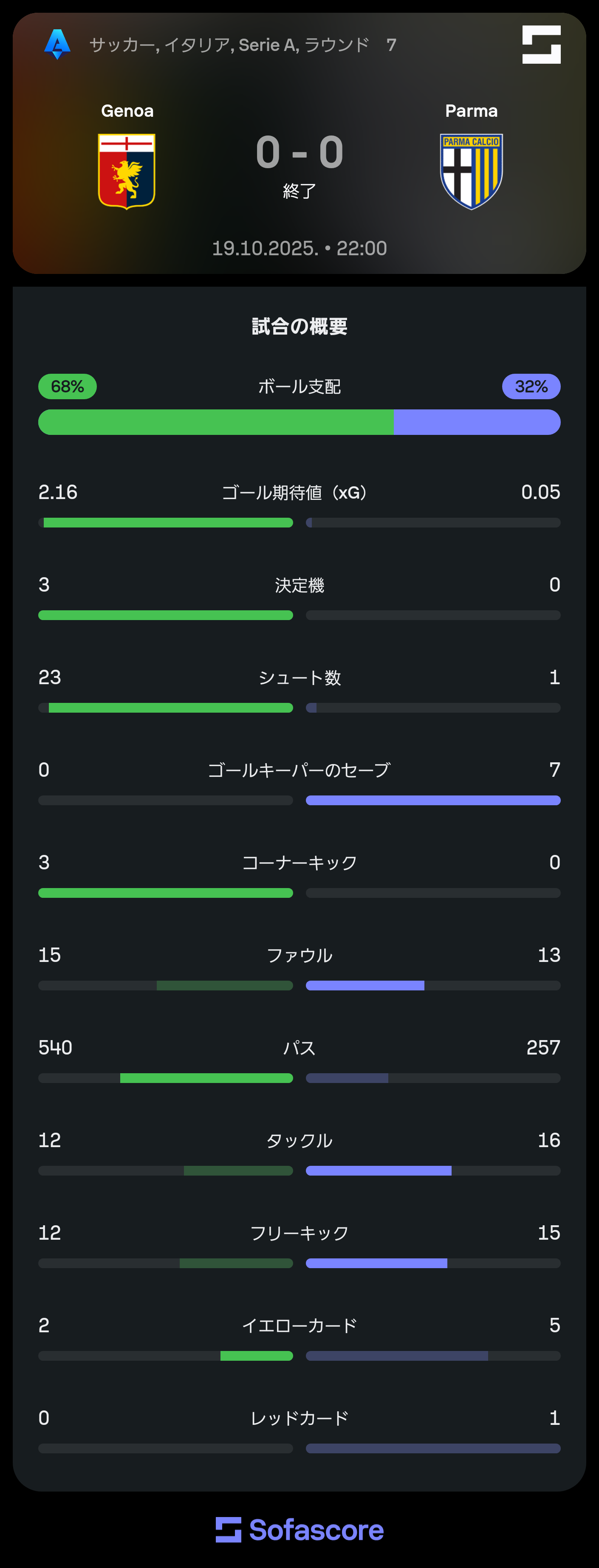 <セリエA:ジェノア0-0パルマ>◇19日◇第7節◇スタディオ・ルイジ・フェッラーリス