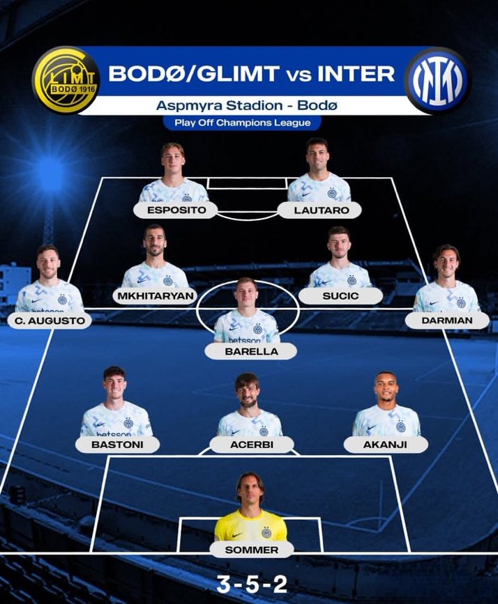 Sommer; Akanji, Acerbi, Bastoni; Darmian, Mkhitaryan, Barella, Sucic, Carlos Augusto; Esposito, Lautaro(C).