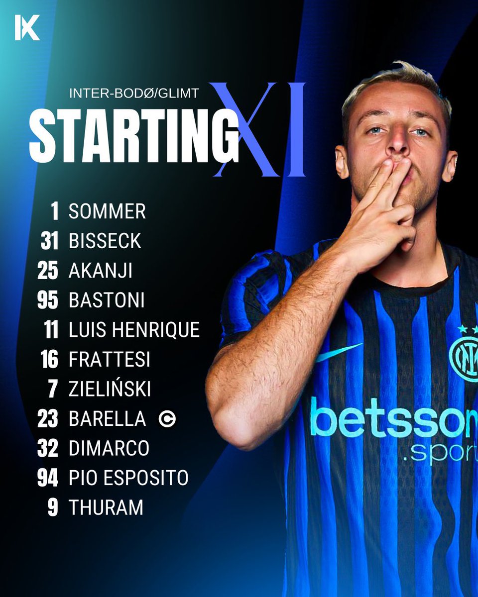 Sommer; Bisseck, Akanji, Bastoni; Luis Henrique, Frattesi, Zielinski, Barella(C), Dimarco; Esposito, Thuram.